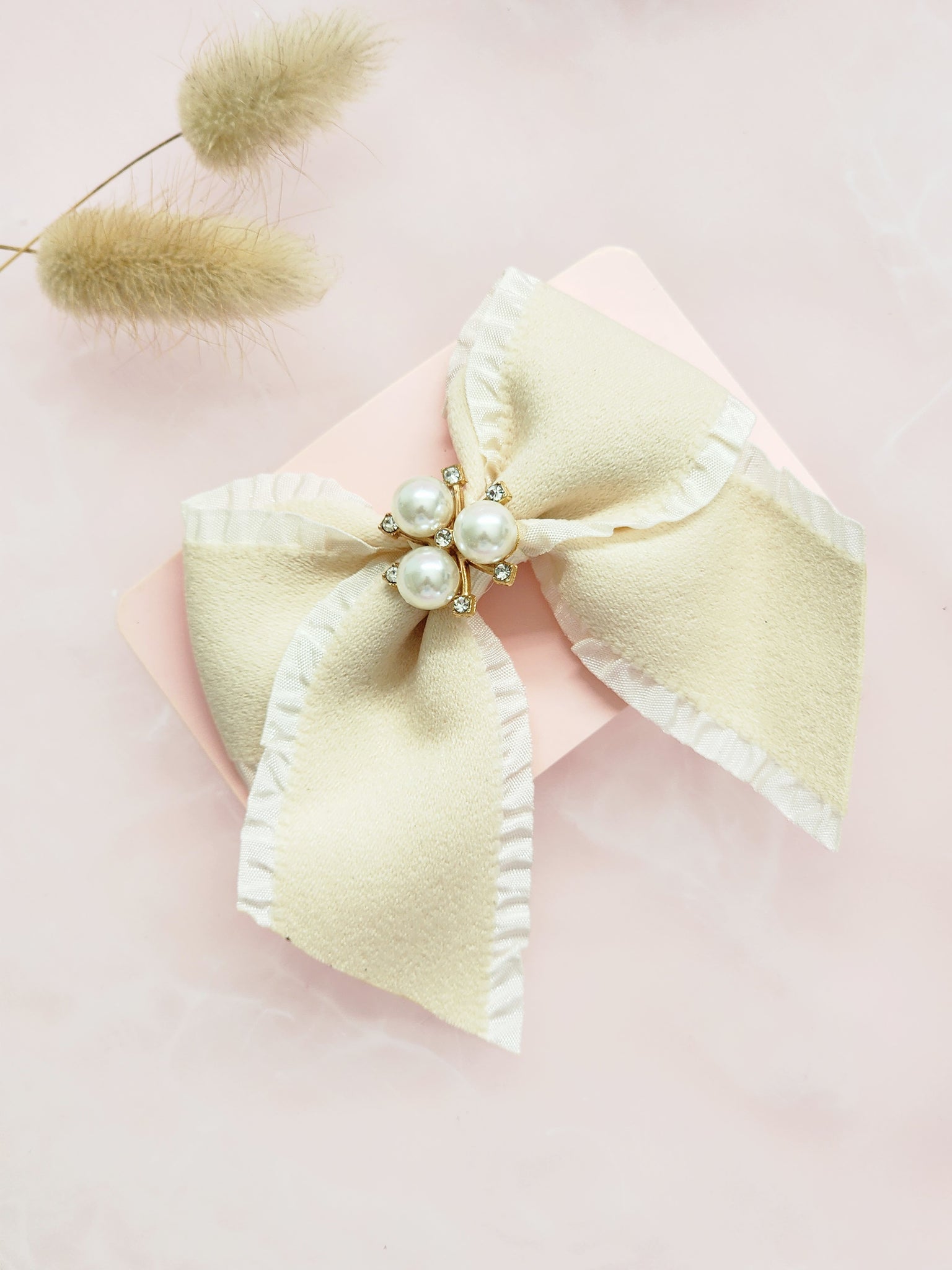 Add the perfect finishing touch to your bridesmaid proposal box with our elegant Bow Hair Clips. Featuring soft frayed-edge ribbon and a pearl cluster center, this clip brings a sweet, timeless look to any bridal party style.